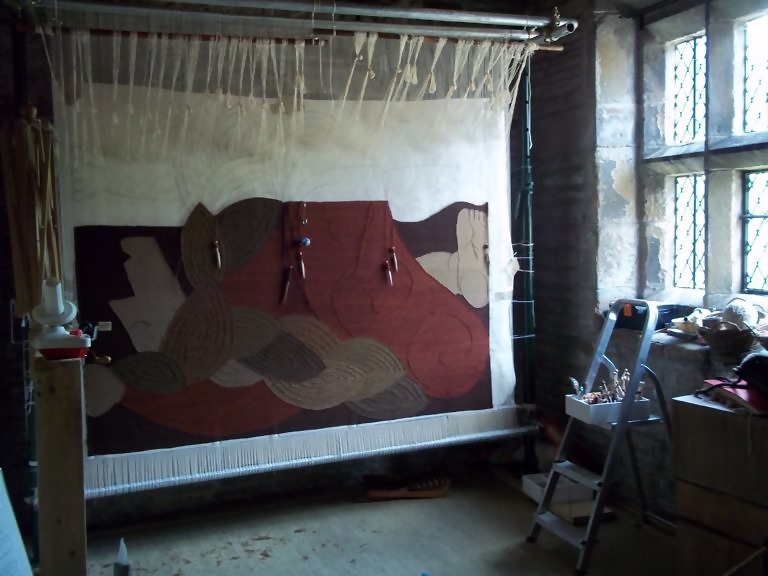 Tapestry weaving has become an increasingly important part of my practice. Whilst I love the act of weaving cloth and exploring things through form, texture, pattern and colour, I also value the ability to tell a story which tapestry provides. I work on an 8ft loom constructed from builders’ scaffolding and on a vintage treadle-operated upright loom. I work with around 8 warps per inch, producing a fine woven tapestry. I use a cotton yarn for my warp and a woollen yarn for my weft, all of which is hand-dyed. I generally work to a large scale, and each project takes months to complete. I am inspired by the mythological, local stories, landscapes and my family’s history and archive.