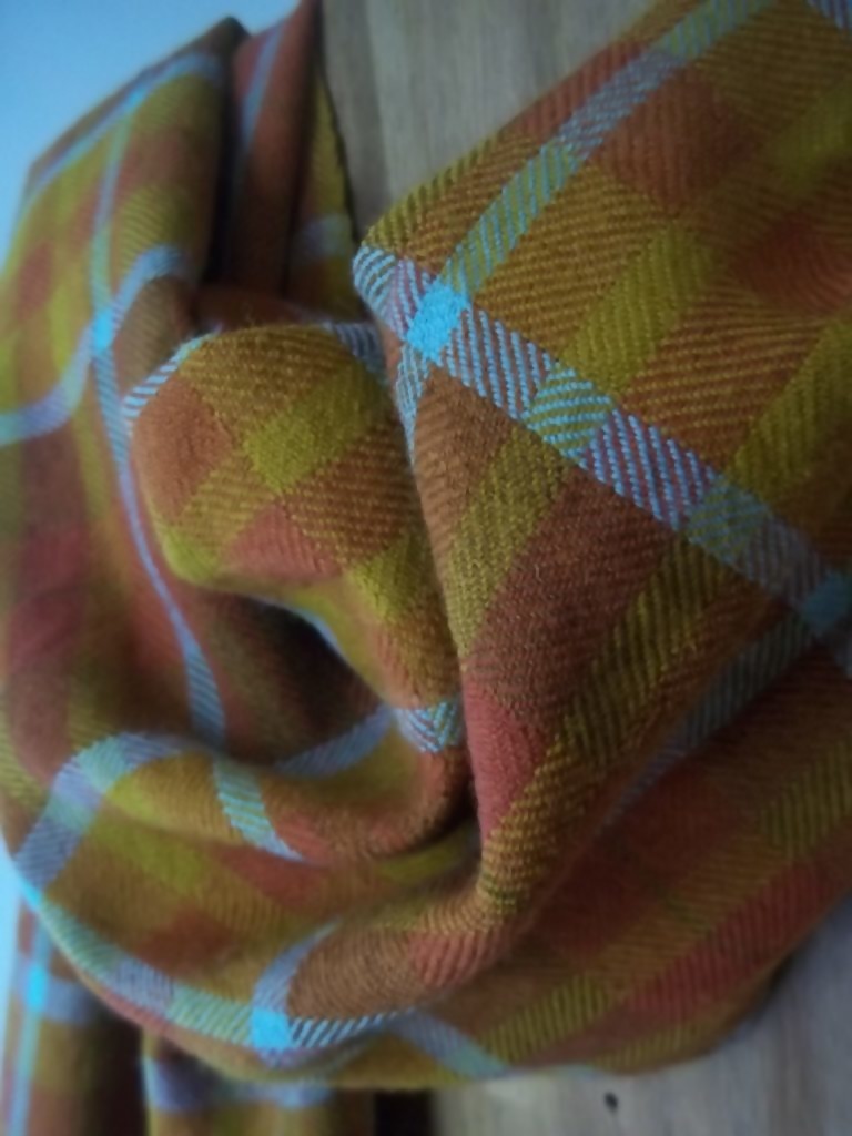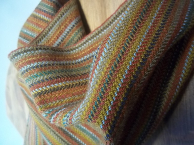 As an archaeologist I’ve been interested in historical textiles for twenty years and first learned to weave on a warp-weighted loom as an undergraduate. I now work on a vintage four-shaft counterbalanced floor loom and enjoy the technical demands of weaving as well as the creative process and am fascinated by its legacy. I am heavily influenced by the muted colours and strong textures of the Yorkshire landscape, its industrial heritage, archaeological and historical textiles, and the work of the early twentieth-century weavers who pioneered the resurgence of handloom weaving. I use natural fibres, mostly wool and silk.